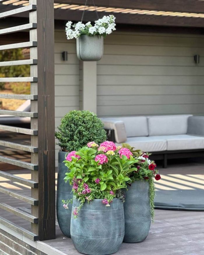 Металл. Оцинкованная сталь или алюминий с порошковым покрытием — про долговечность и строгий вид. Металлические уличные кашпо уместны в современных и индустриальных проектах.