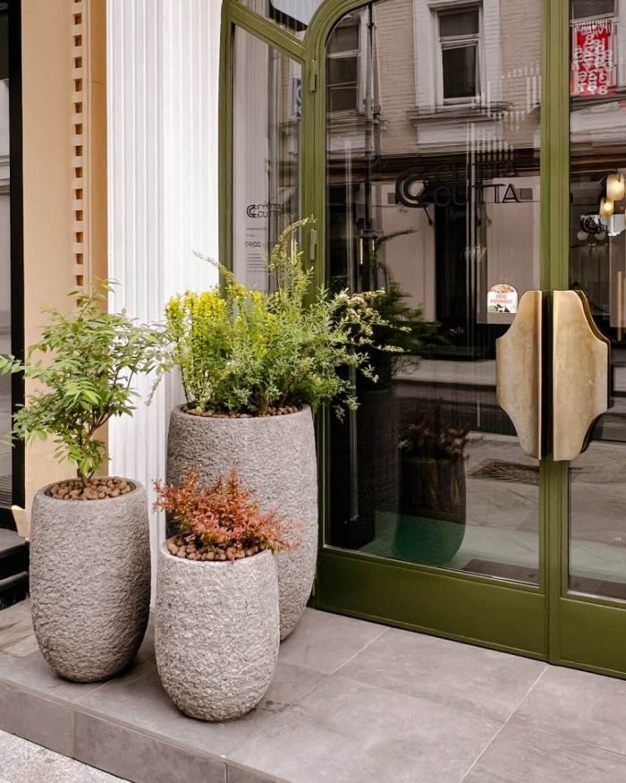 Цвет уличного кашпо лучше подбирать из палитры фасада и мощения: графит, антрацит, белый, бетон, тёплый песочный, бронза. Нейтральные оттенки подчёркивают зелень и не спорят с вывеской. Если хочется акцента, используйте его точечно и поддержите в мебели или подсветке. Глянец даёт эффект праздника, матовые и «каменные» фактуры выглядят спокойнее и дороже. Для современных объектов уместны чёрные и металлические поверхности; для загородных домов — бетонные и «под дерево».