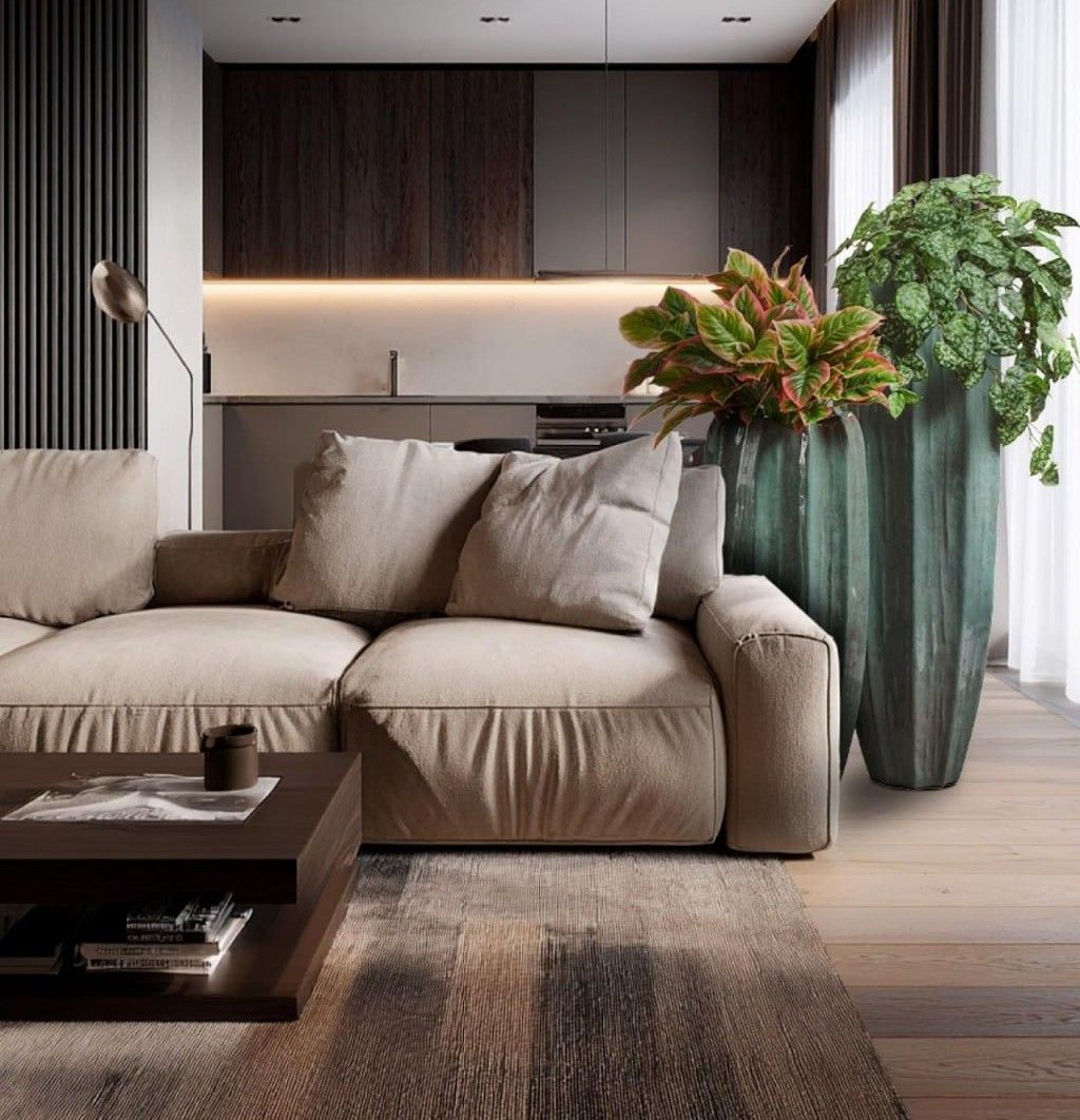Гостиная. Высокая кашпо-ваза в жемчужном лаке у дивана или камина задаёт тон всему пространству. Изумрудный вариант добавляет глубину и работает как цветовой акцент.