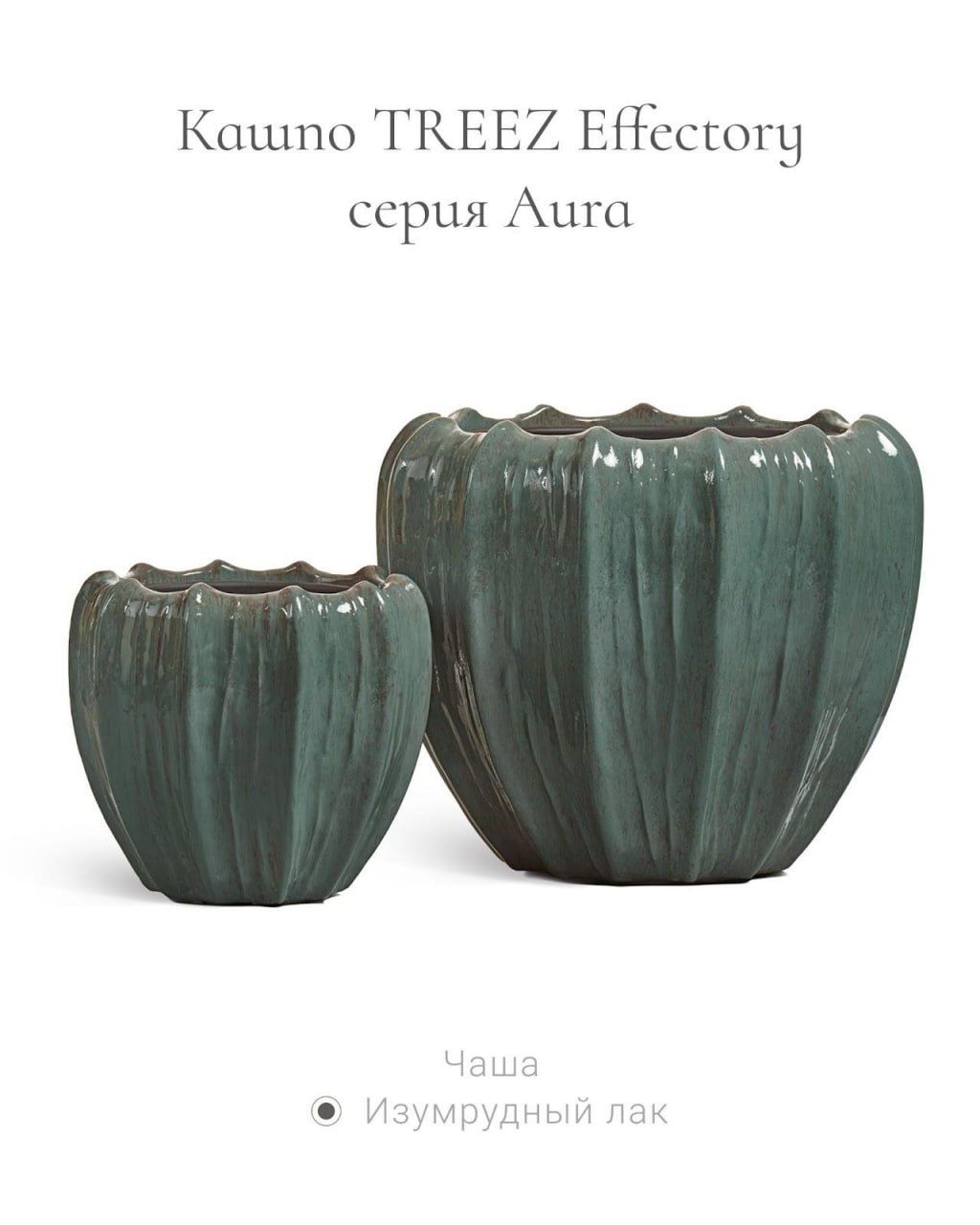 Aura — это лаковые кашпо с глубоким, многослойным покрытием. Два цвета задают настроение серии: жемчужный лак — тёплый, мерцающий, с перламутровым отблеском, напоминающий внутреннюю поверхность морской раковины; изумрудный лак — глубокий, насыщенный, с ассоциациями южных морей и драгоценных камней.
