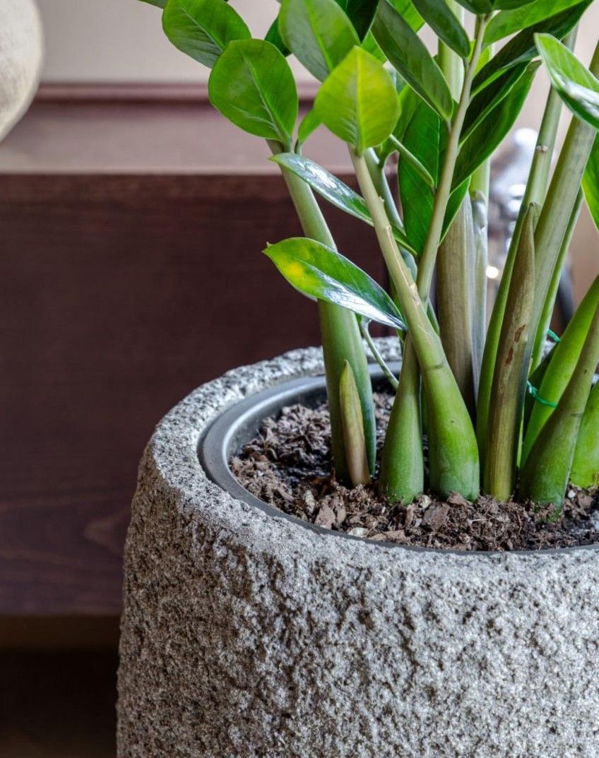 Фактура Terra лучше всего раскрывается с растениями «дикого» характера: лемонграсс, альпийское разнотравье, папоротники, туи. В каталоге TREEZ есть готовые решения — композиции, специально подобранные под кашпо Terra. Впрочем, фикусы, оливы и монстеры тоже смотрятся органично — земельная фактура подчёркивает зелень любого растения.