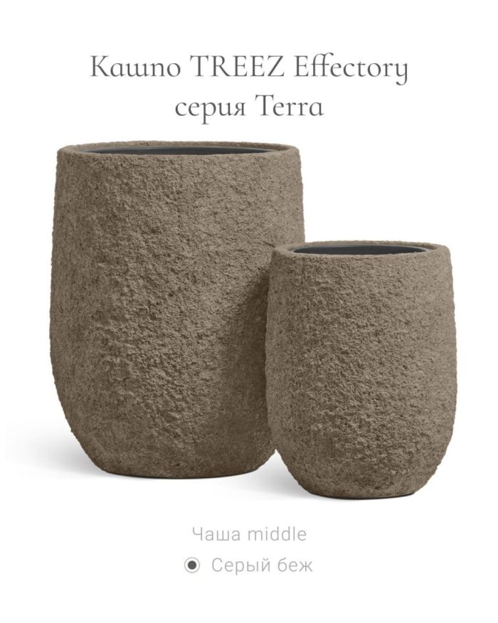 Среди серий TREEZ Effectory коллекция Terra занимает особое место. Если Metal — про статус, Gloss — про чистоту линий, Beton — про городской минимализм, то Terra — про возвращение к природным истокам. Это кашпо для интерьеров, где ценятся натуральные материалы и спокойная палитра.