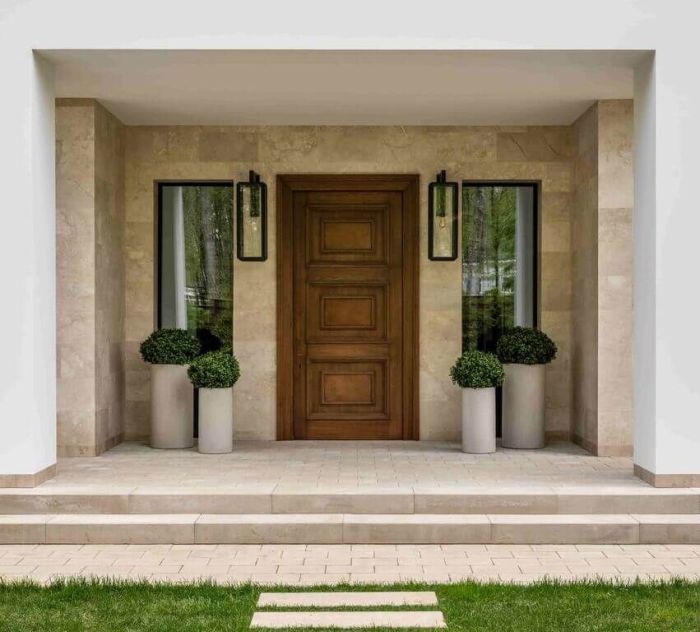 Терраса и входная группа. Уличные кашпо с устойчивыми материалами задают порядок и подчёркивают архитектуру фасада.