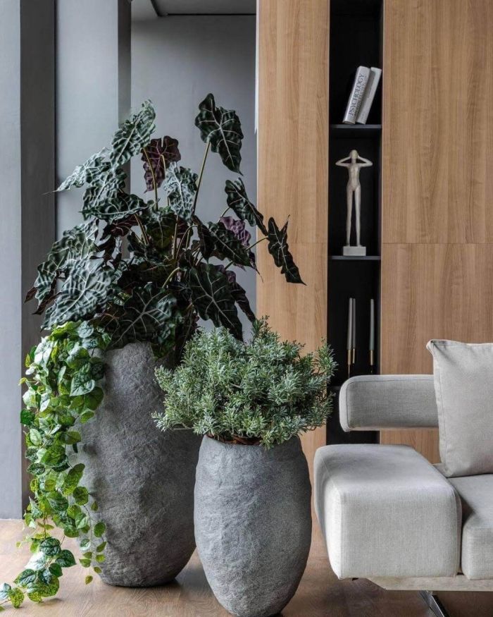 Грамотно собранная композиция делает интерьер цельным и аккуратным. На длинной стене ряд из одинаковых кашпо задаёт ритм, на консоли три вазона разной высоты создают глубину, возле дивана пара компактных форм завершает зону отдыха. В офисе композиции из горшечных растений мягко зонируют open space, на стойке ресепшена подчеркивают брендовый характер, в кафе и салонах помогают ориентироваться и создают приятный фон для общения и фотографий.