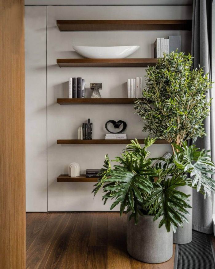 Композиции на горизонталях подчиняются простому правилу: каждый элемент должен занимать не более половины ширины поверхности и не «резаться» горизонталями мебели. Высота напольной композиции — до трети высоты ближайшей стены; настольной — так, чтобы не перекрывать свет и обзор. Для длинных стен лучше ряд из двух-трёх средних композиций вместо одного гиганта: так интерьер выглядит спокойнее и дороже.